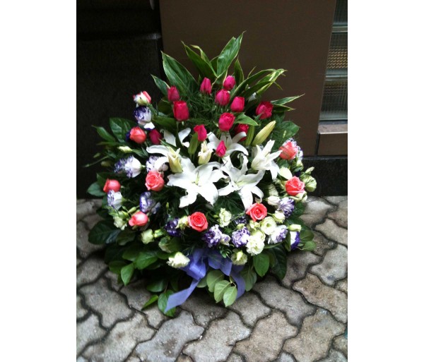 BK12 MIXED COLOUR ROSES WITH LILIES FLOWER BASKET