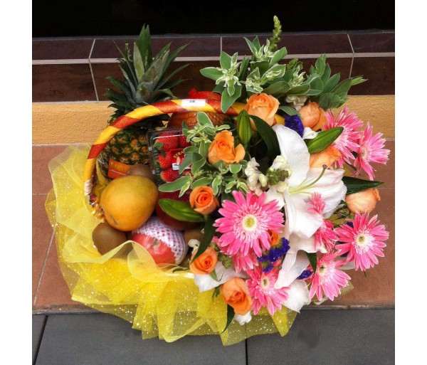 H2 ASSORTED FRUITS HAMPER WITH PINK GERBERAS & GREENERIES