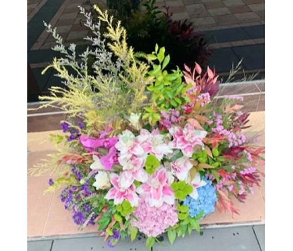 A LARGE FLOWER BASKET WITH PURPLE ORCHIDS, TIGER LILIES, HYDRANGEAS AND MIXED FLOWERS. THIS FLOWER IS SUITABLE FOR ALL OCCASIONS.