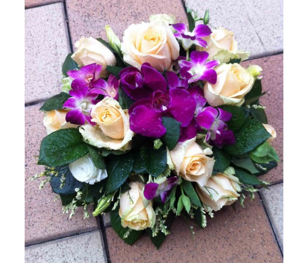 T36 12 PCS CHAMPAGNE ROSES WITH PURPLE ORCHID TABLE FLOWER IN ROUND