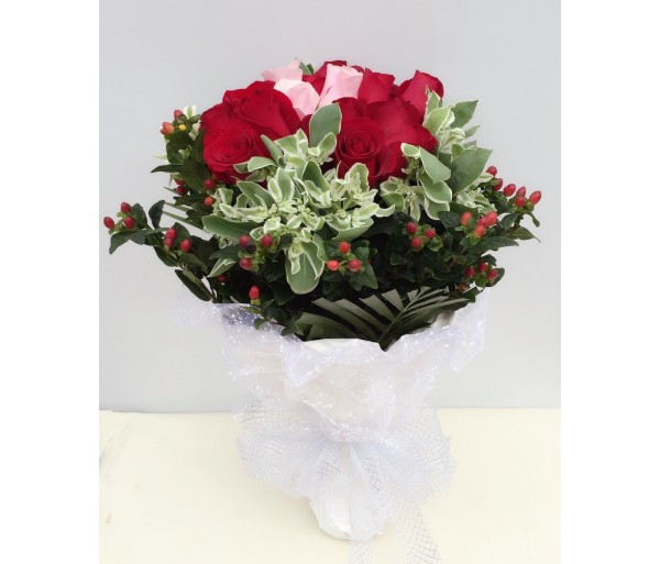 THIS 24 ROSES BOUQUET COMPRISE 20 REDS + 4 PINK ROSES WITH WHITE ROUND WRAP