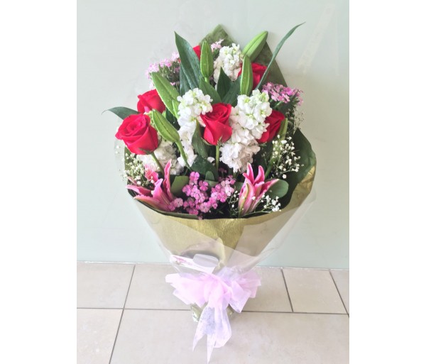 F43 TIGER LILIES WITH 6 RED ROSES BOUQUET