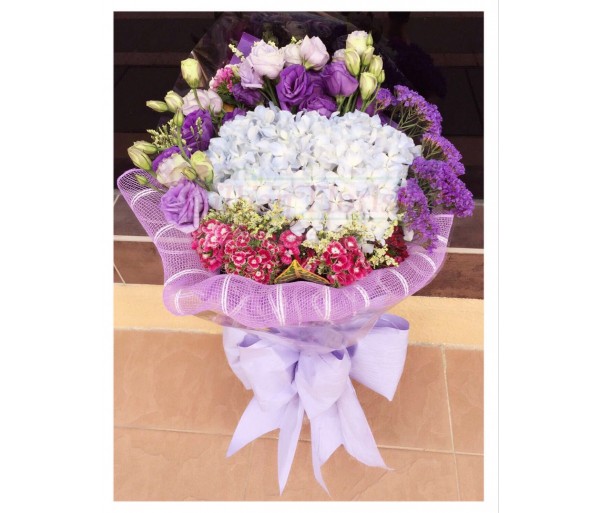 F110 BLUE HYDRANGEAS WITH PURPLE MATCHING FLOWERS IN PURPLE WRAP