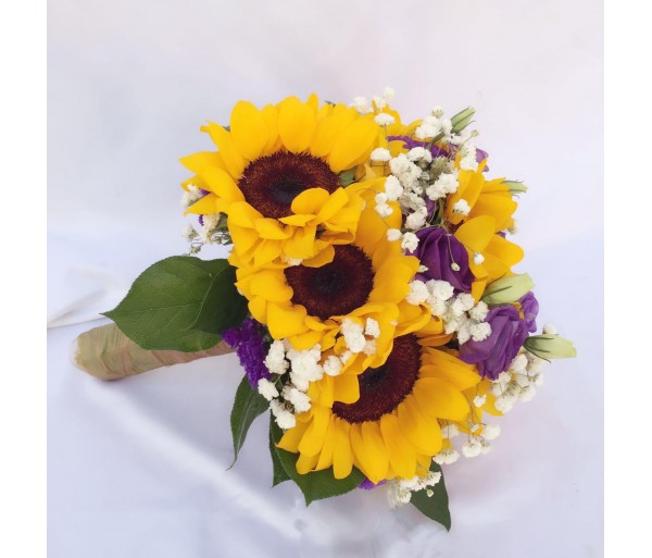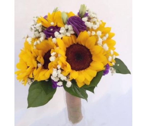 A NICE SUNFLOWER BRIDAL BOUQUET AROUND 8" INCHES IN DIAMETER, PERFECT FOR SUMMER WEDDINGS. A MATCHING OF TABLE FLOWERS, CORSAGES, CHAIR DECORATION ALSO AVAILABLE