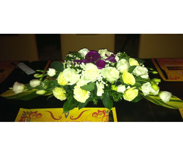 T45 WHITE ROSES WITH PURPLE ORCHID LONG TABLE DISPLAY
