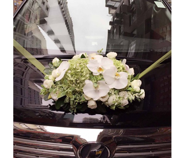 B28 GREEN HYDRANGEAS WITH WHITE ORCHIDS CAR FLOWER